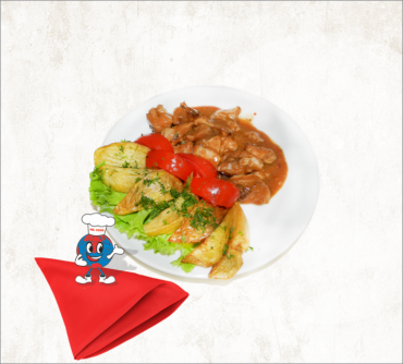 ქათმის რბილი, შავი პილპილი, მარილი, დაღერღილი წიწაკა, ძირა, სოიოს სოუსი, კეტჩუპი, ლიმონი, ზეთი, კარტოფილი, პომიდორი, ბულგარული წიწაკა მწვანე, ოხრახუში, ხახვი