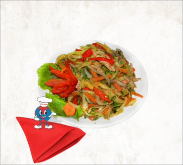 ქათმის ხორცი, ხახვი, ბულგარული წიწაკა წითელი, ბულგარული წიწაკა მწვანე, სტაფილო, კარტოფილი, ოხრახუში, კამა, ნიორი, უცხო სუნელი, ხმელი ქინძი, მარილი, შავი პილპილი, დაღერღილი წიწაკა, მწვანე წიწაკა
